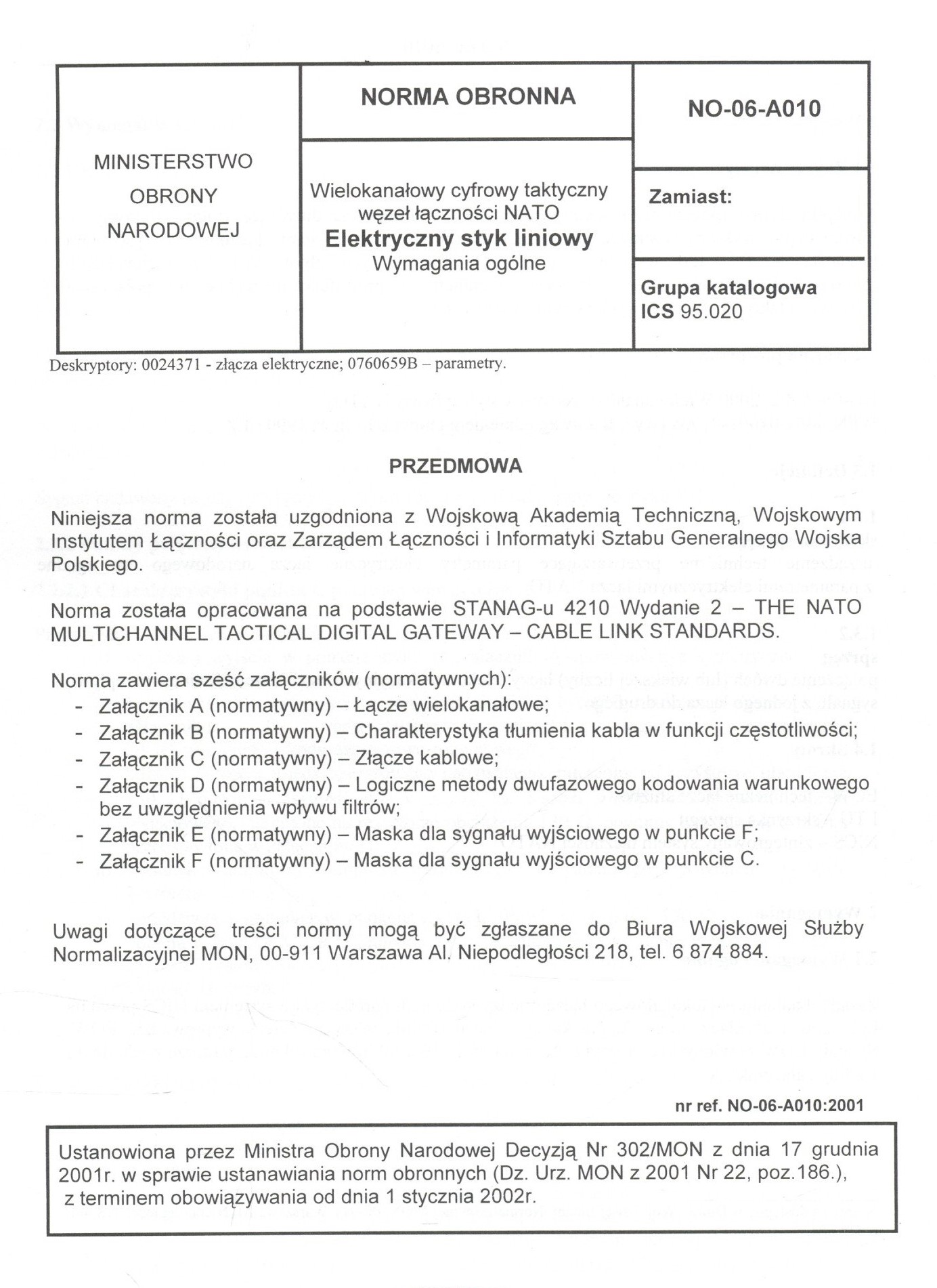 Ustanowiona przez Ministra Obrony Narodowej Decyzją Nr 302/MON z dnia 17 grudnia 2001 r. w sprawie ustnawiania norm obronnych (Dz. Urz. MON z 2001 r. Nr 22, poz. 186) z terminem obowiązywania od dnia 1 stycznia 2002 r.