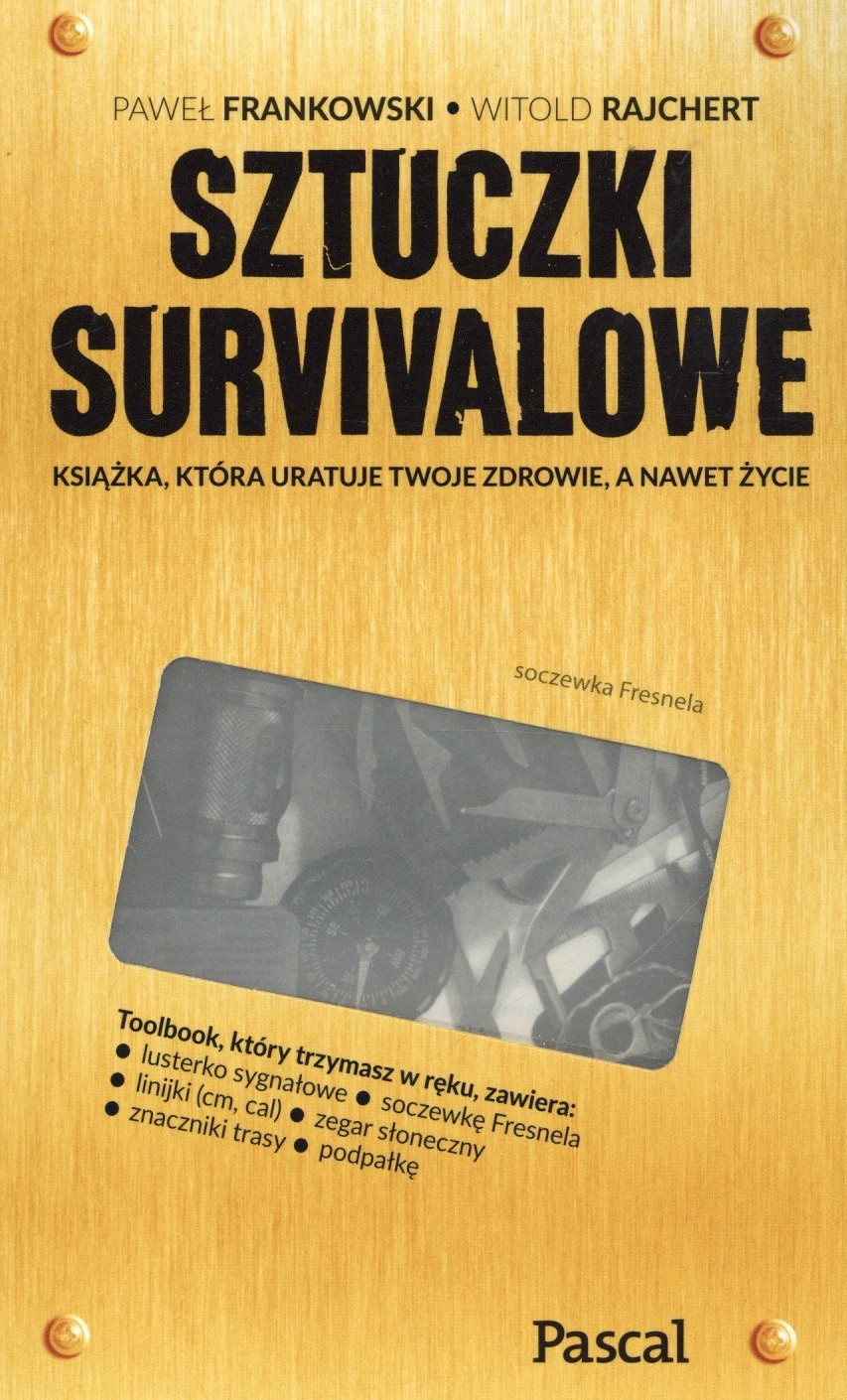 Na okł.: Toolbook, który trzymasz w ręku zawiera: lusterko sygnałowe, soczewkę Fresnela, linijki (cm, cal), zagar słoneczny, znaczniki trasy, podpałkę.