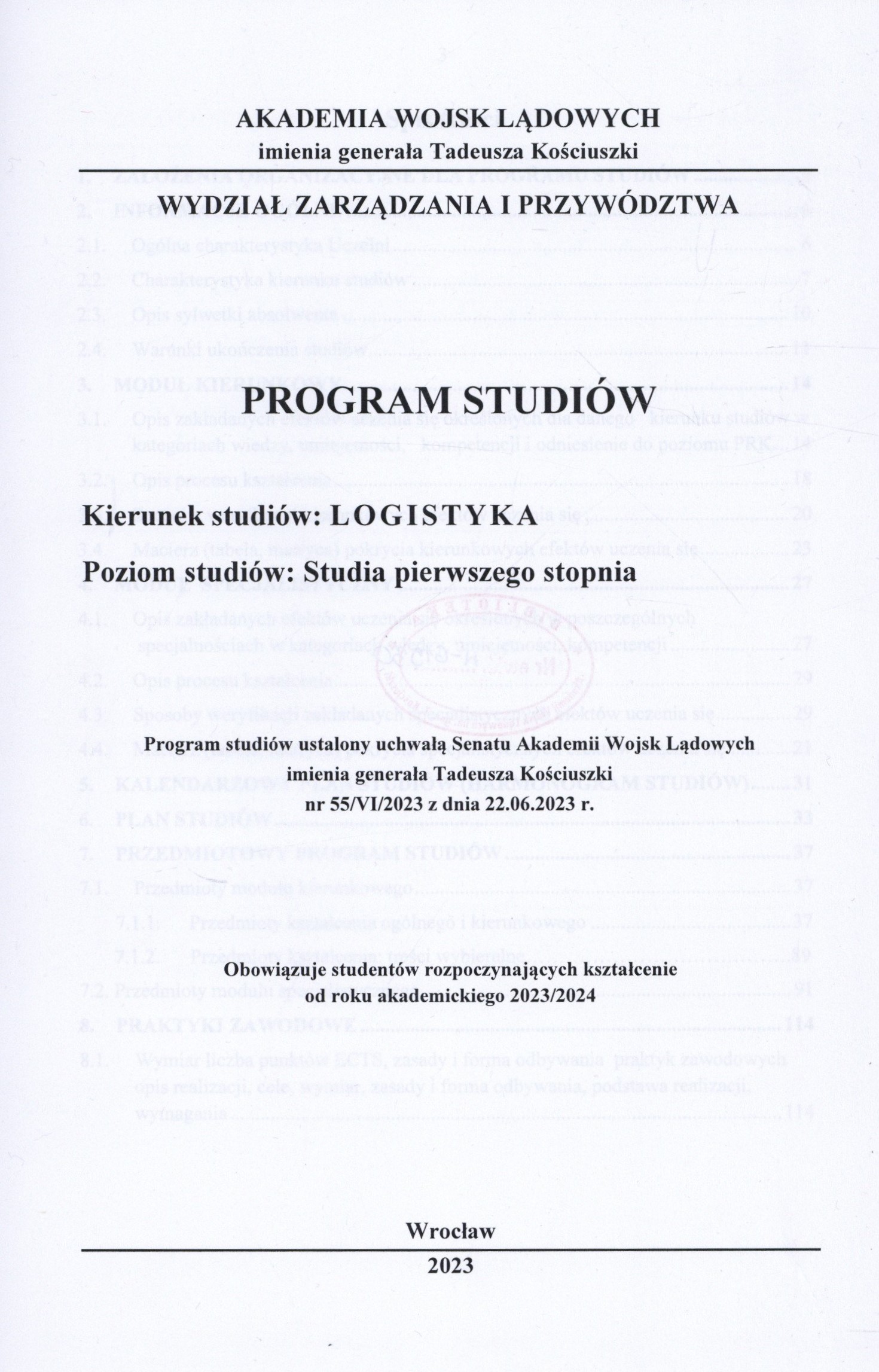 Program studiów ustalony uchwałą Senatu Akademii Wojsk Lądowych imienia generała Tadeusza Kościuszki nr 55/VI/2023 z dnia 22.06.2023r.