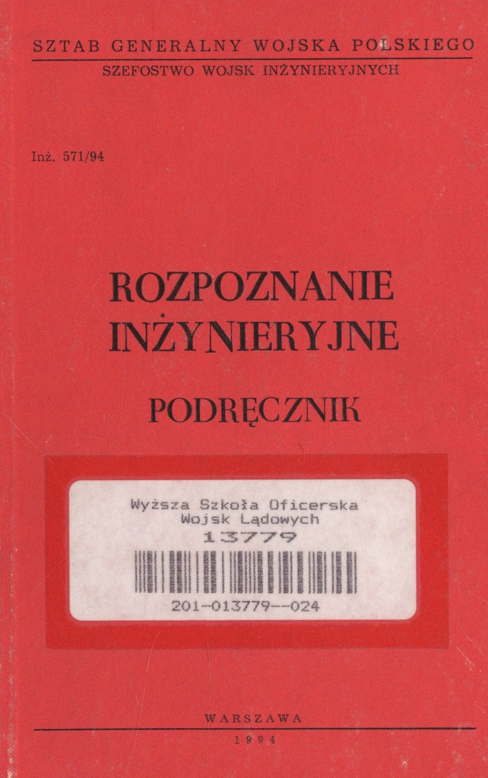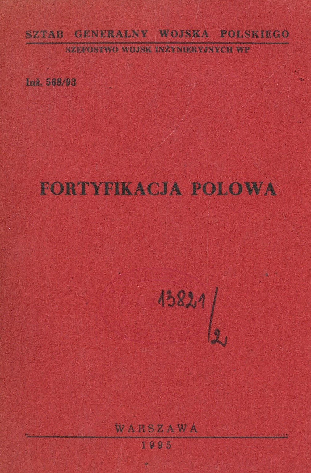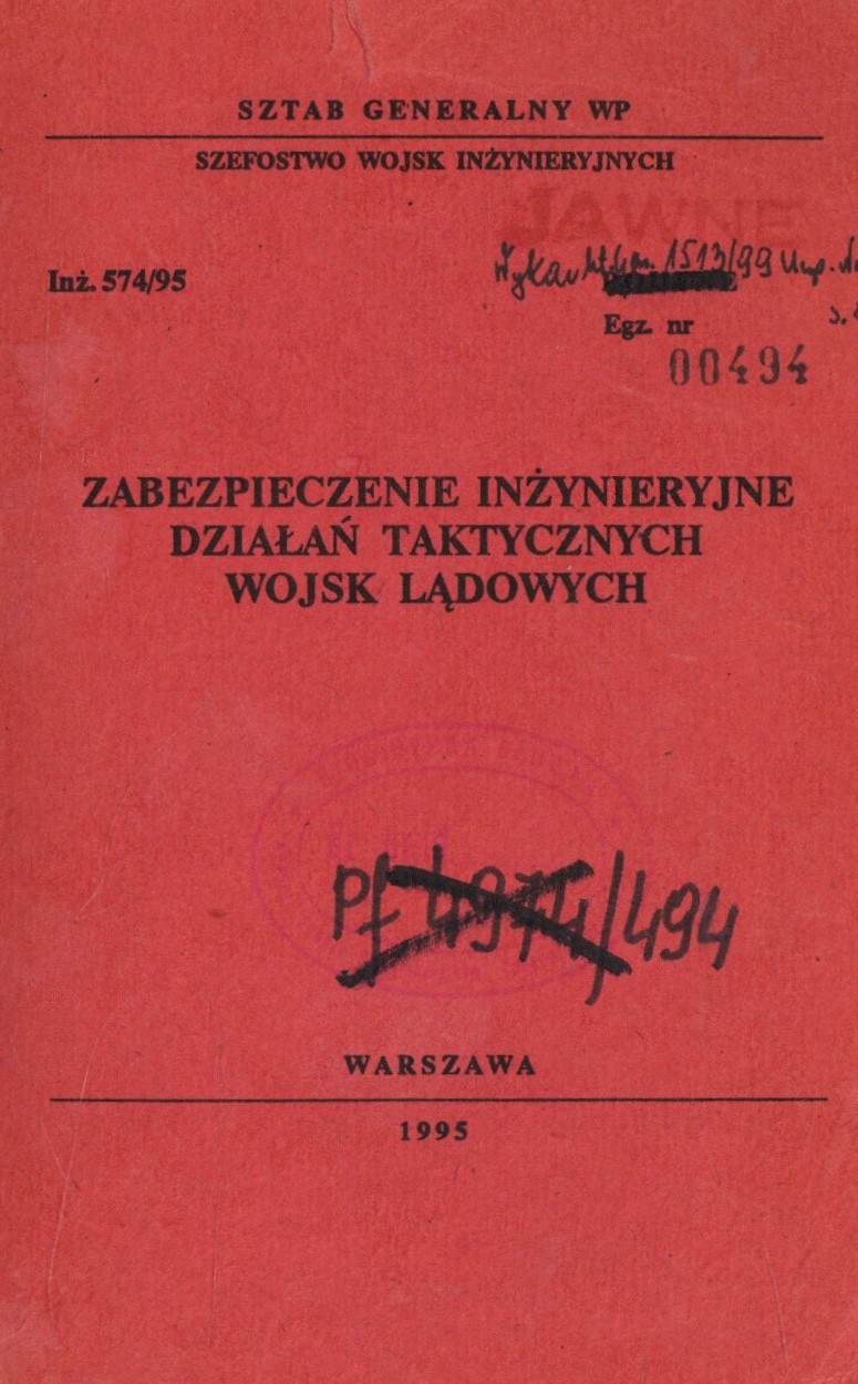 Fortyfikacja polowa / Sztab Generalny Wojska Polskiego. Szefostwo Wojsk Inżynieryjnych WP. - Obowiazuje od 02.01.1994 r. - Warszawa : Szt. Gen. WP Szef. Wojsk Inż., 1995. - 241 s., [1] k. tabl. złoż. : il., 15 zał. ; 21 cm.