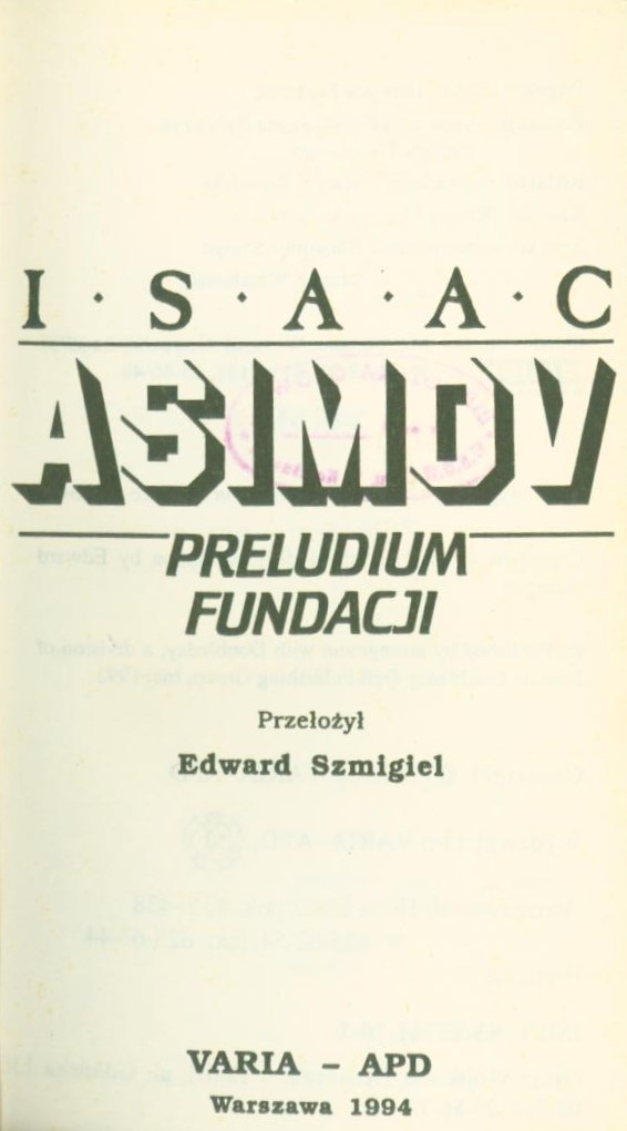 Preludium fundacji / Isaac Asimov ; przeł. Edward Szmigiel. - Wyd. 2. - Warszawa : Varia-APD, 1994. - 507 s. ; 18 cm.